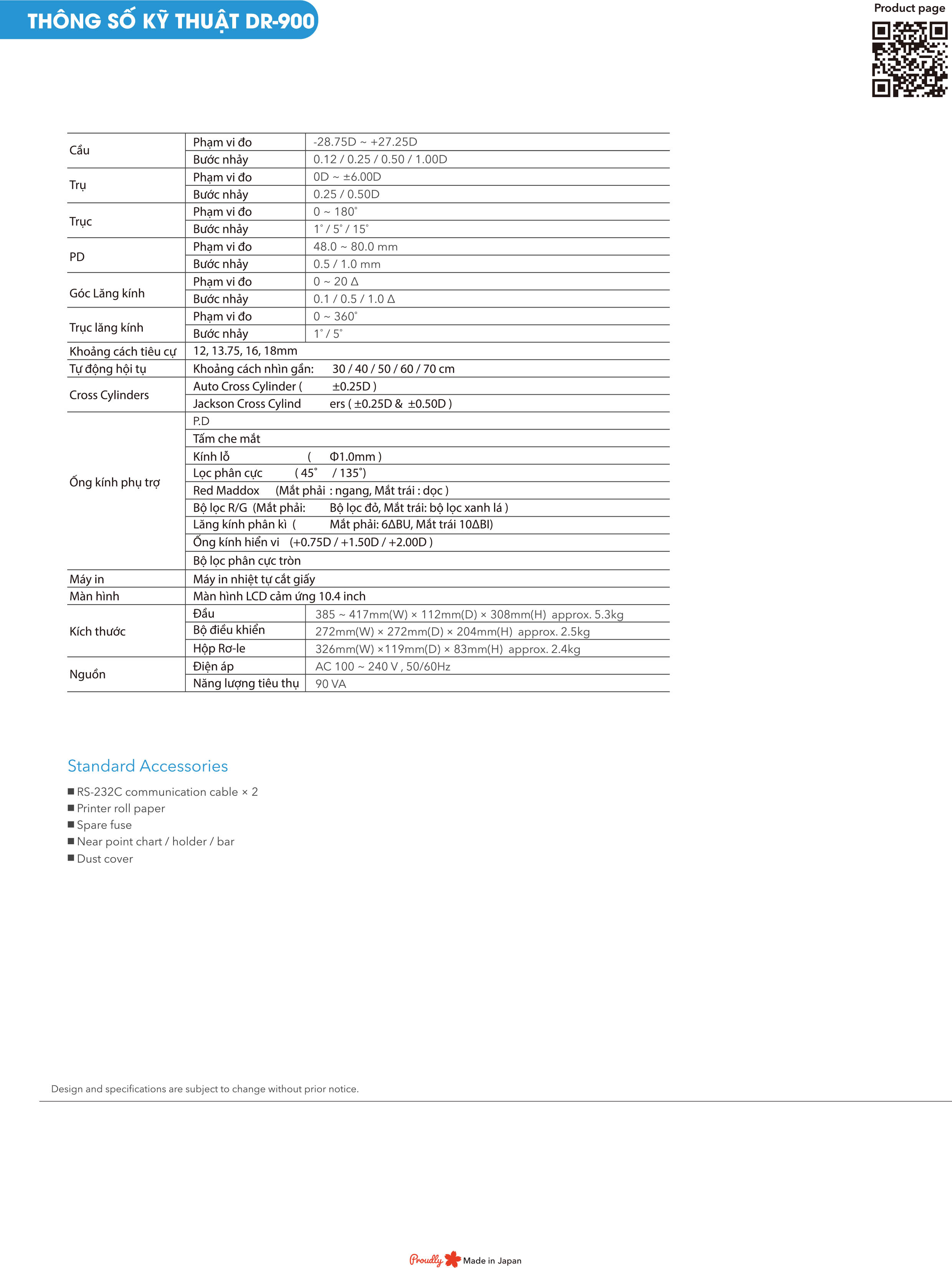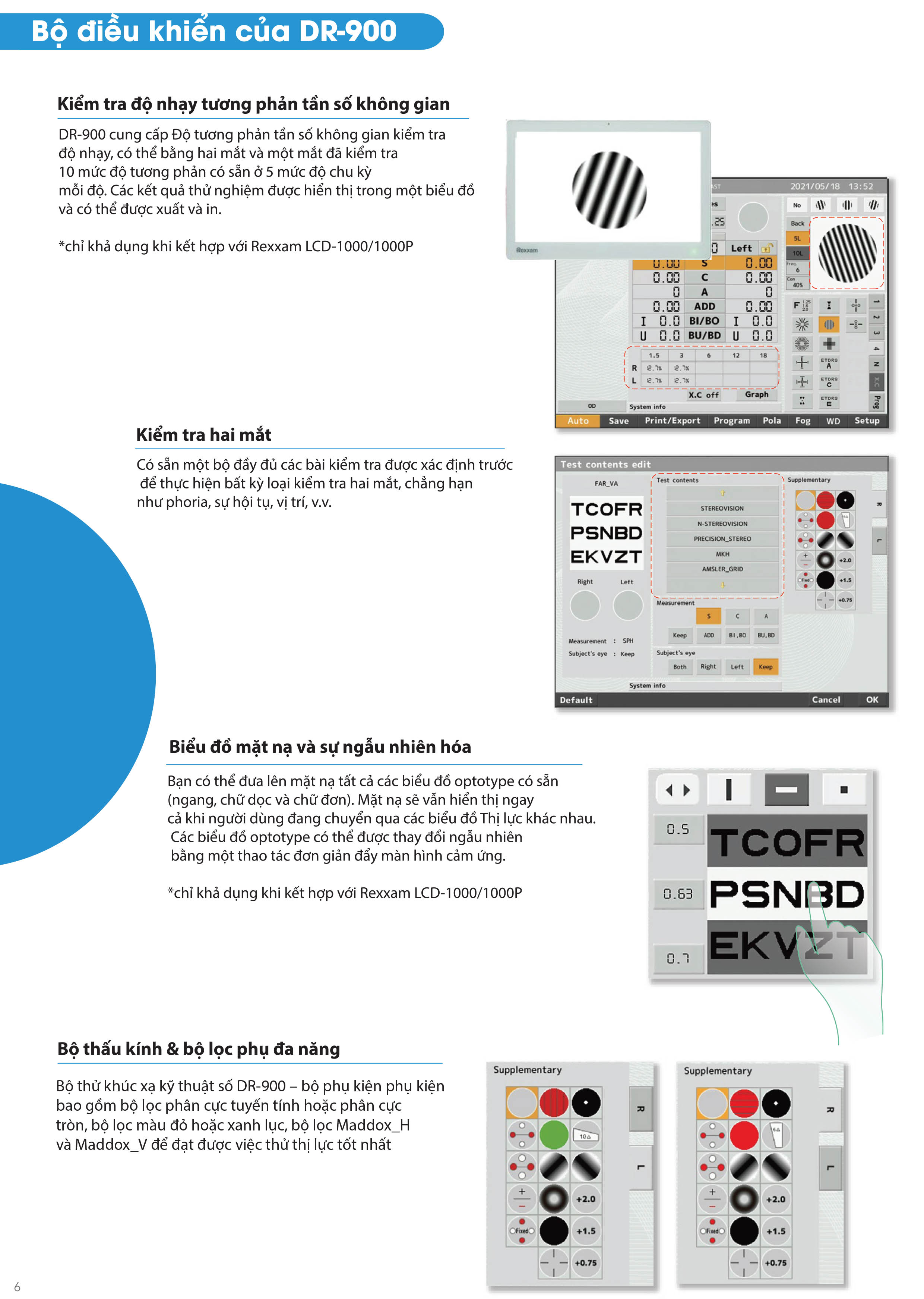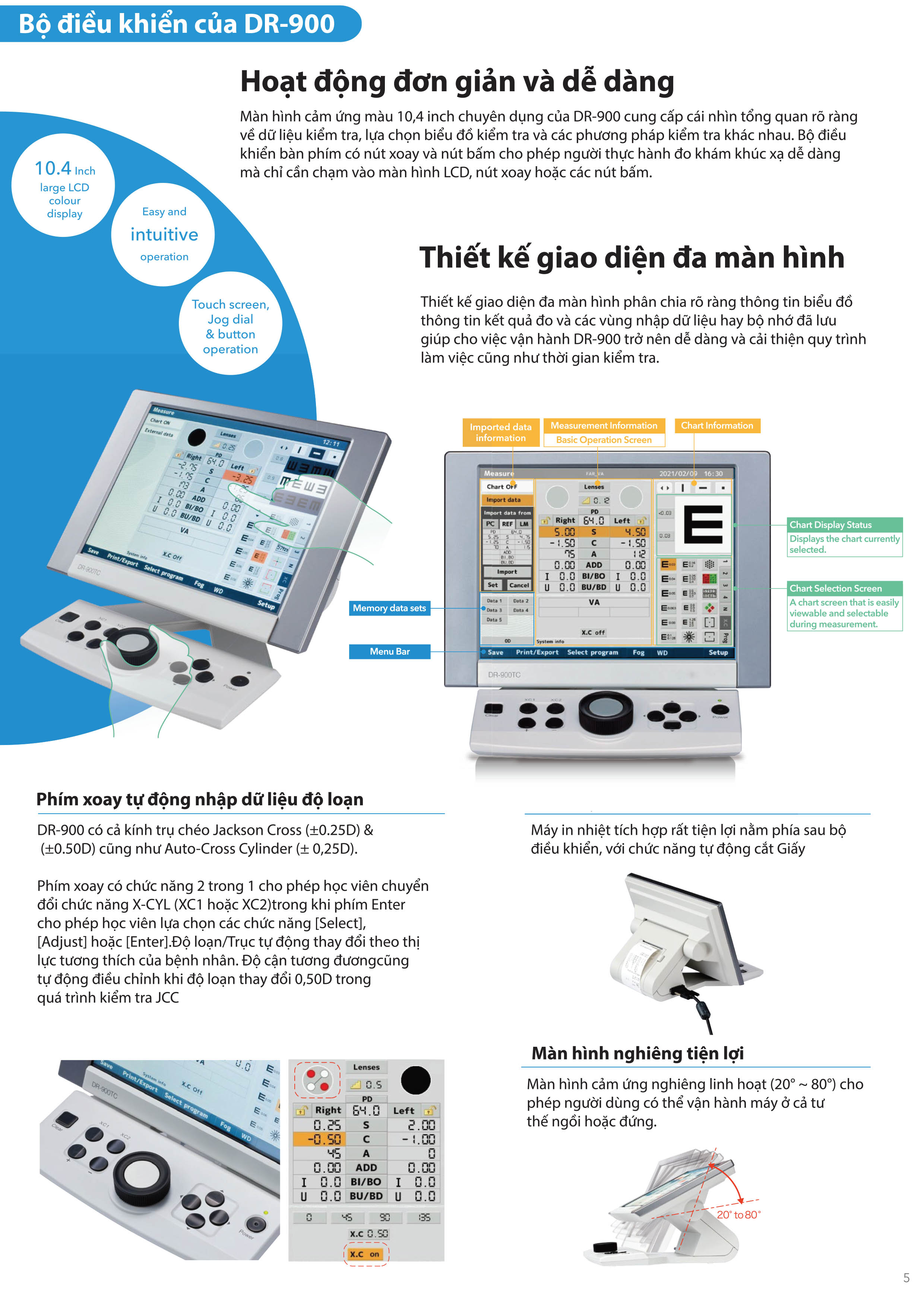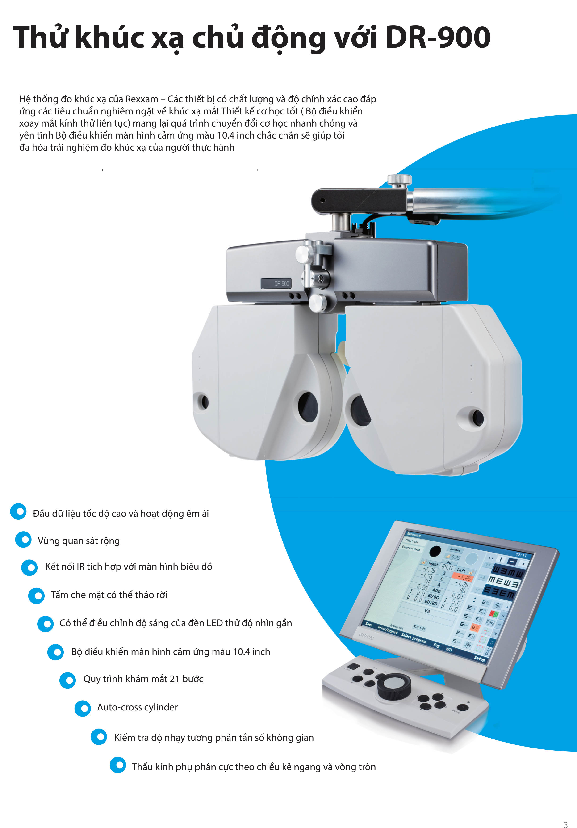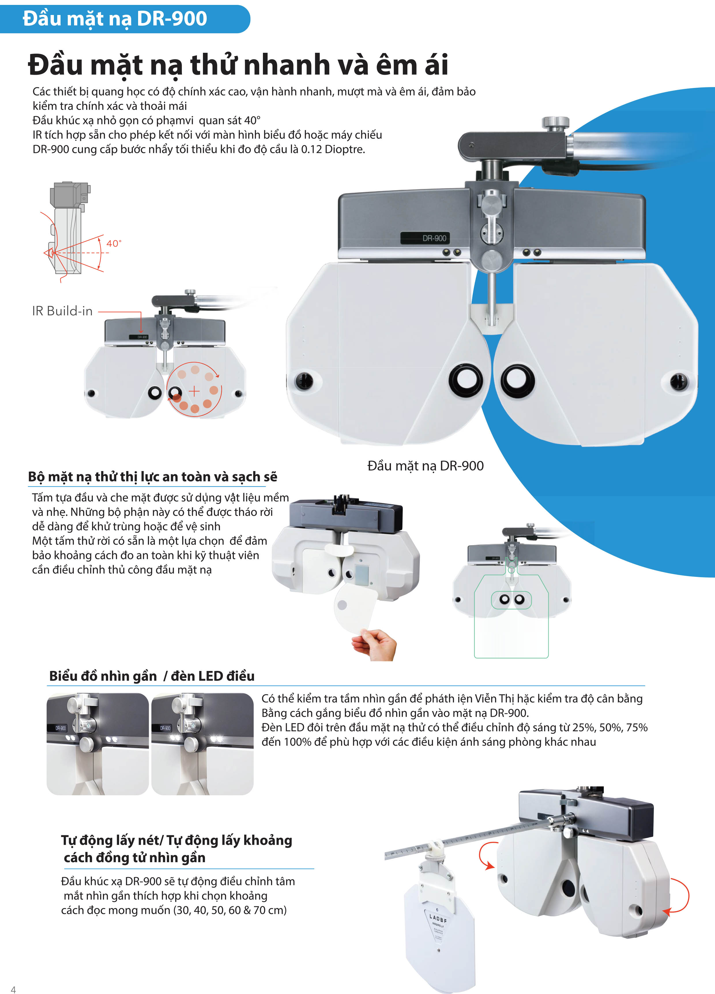 Bộ thử thị lực kỹ thuật số DR-900 - đo quang học chính xác và chất lượng cao đáp ứng các tiêu chuẩn nghiêm ngặt về khúc xạ mắt. Thiết kế cơ học bộ xoay ống kính điều khiển tuần tự rất mượt mà, mang lại quá trình chuyển đổi cơ học nhanh chóng và yên tĩnh. Đầu bộ mặt nạ khúc xạ nhỏ gọn thông minh & bộ điều khiển màn hình cảm ứng đủ màu (10,4 inch) chắc chắn sẽ giúp tối đa hóa trải nghiệm đo khúc xạ của người vận hành.