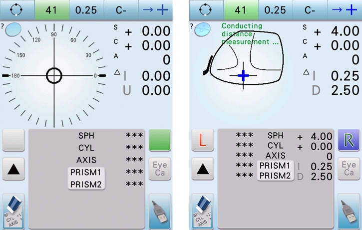 Khoảng cách đồng tử như LPD / RPD, PD, có thể được đo dễ dàng bằng cách căn chỉnh kính được đánh dấu theo thang hiển thị trên màn hình. Màu màn hình có thể được thay đổi thành đen hoặc trắng tùy thuộc vào màu đánh dấu để hiển thị kết quả đo rõ hơn.