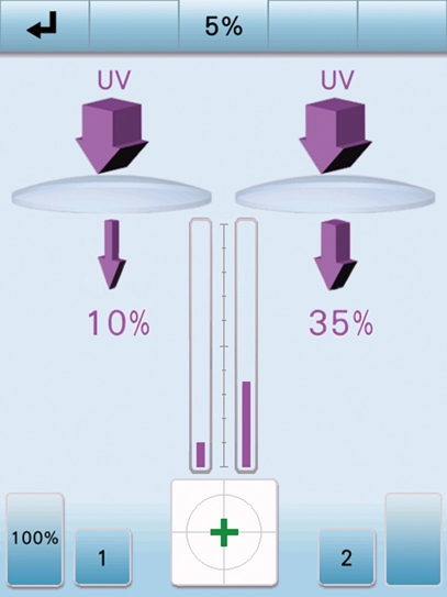 Độ truyền tia UV được trình bày dưới dạng màn hình trực quan từ 0 đến 100% bước sóng trung tâm 365 nm (UV-A) với gia số 1 hoặc 5%.