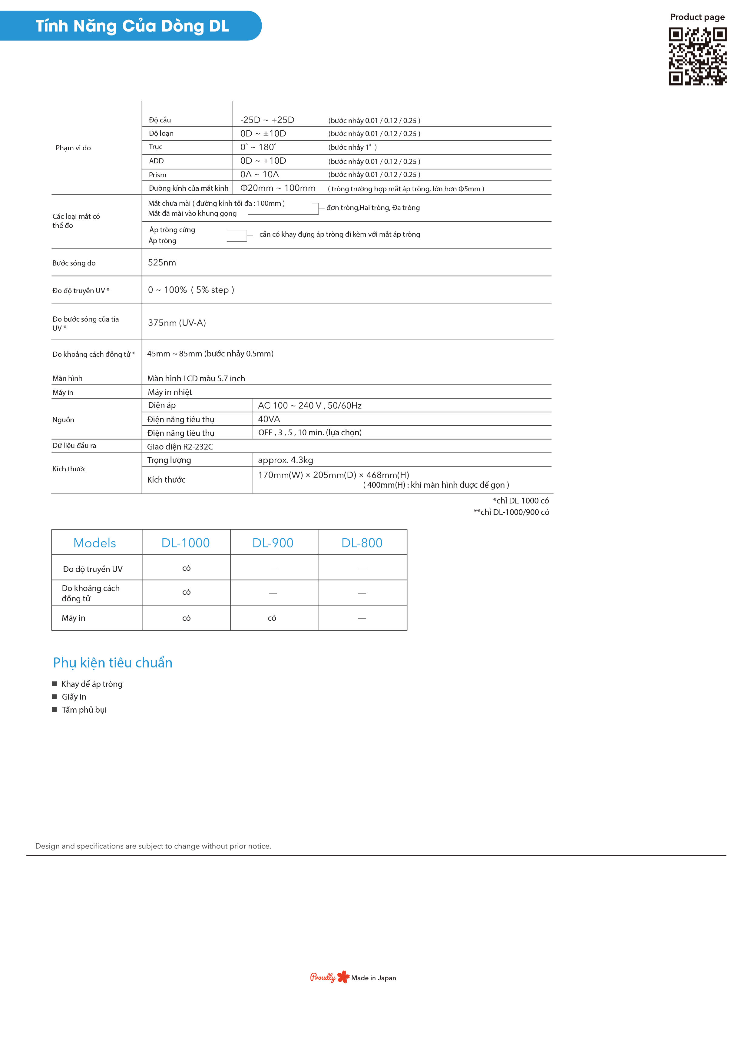 Thiết kế nhỏ gọn và thanh lịch thích hợp với tất cả các hoạt động đo đạt. DL-900 có kèm máy in, trong khi đó model cao cấp nhất DL-1000 có thể đo được cả độ truyền tia UV và khoảng cách đồng tử.