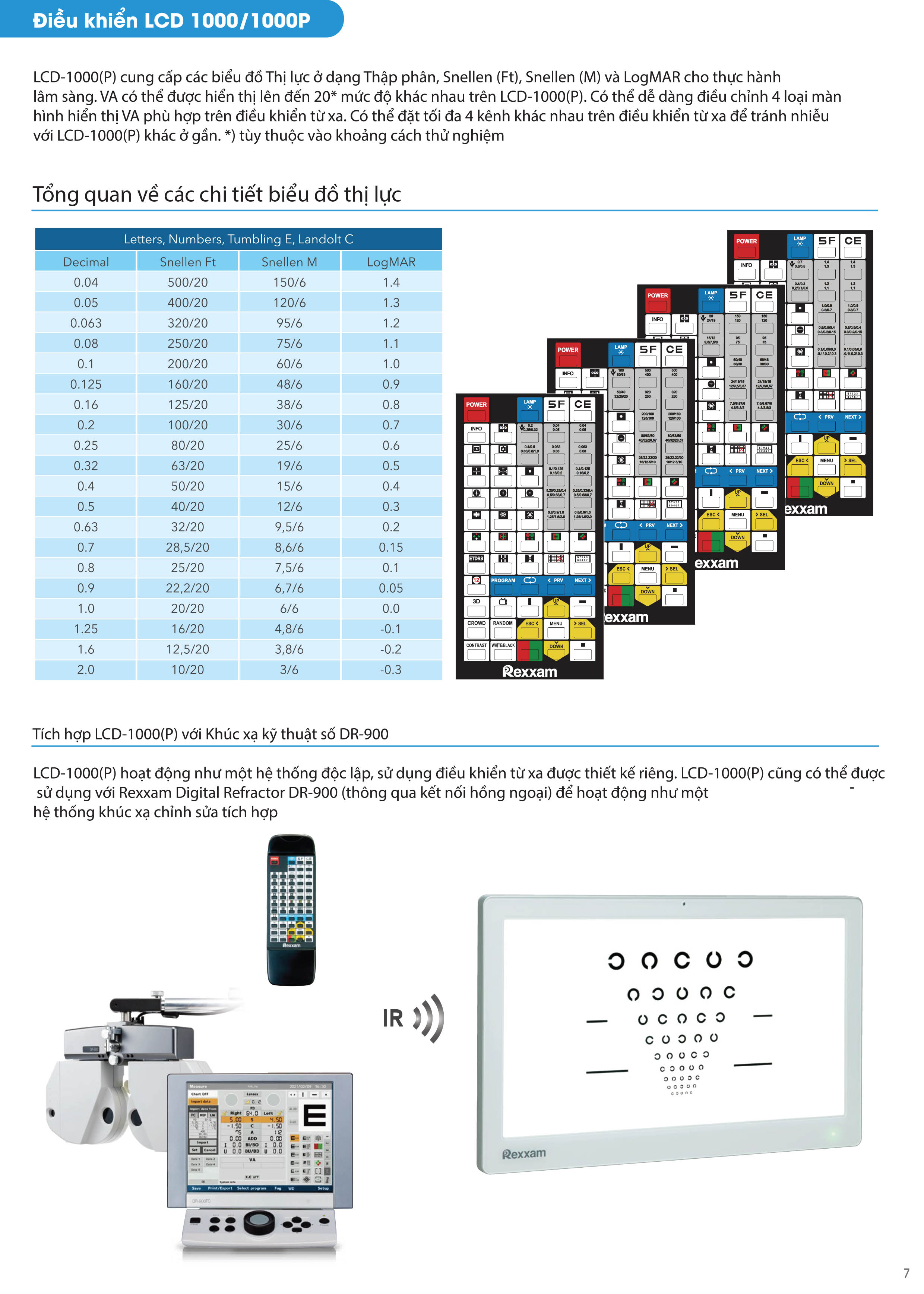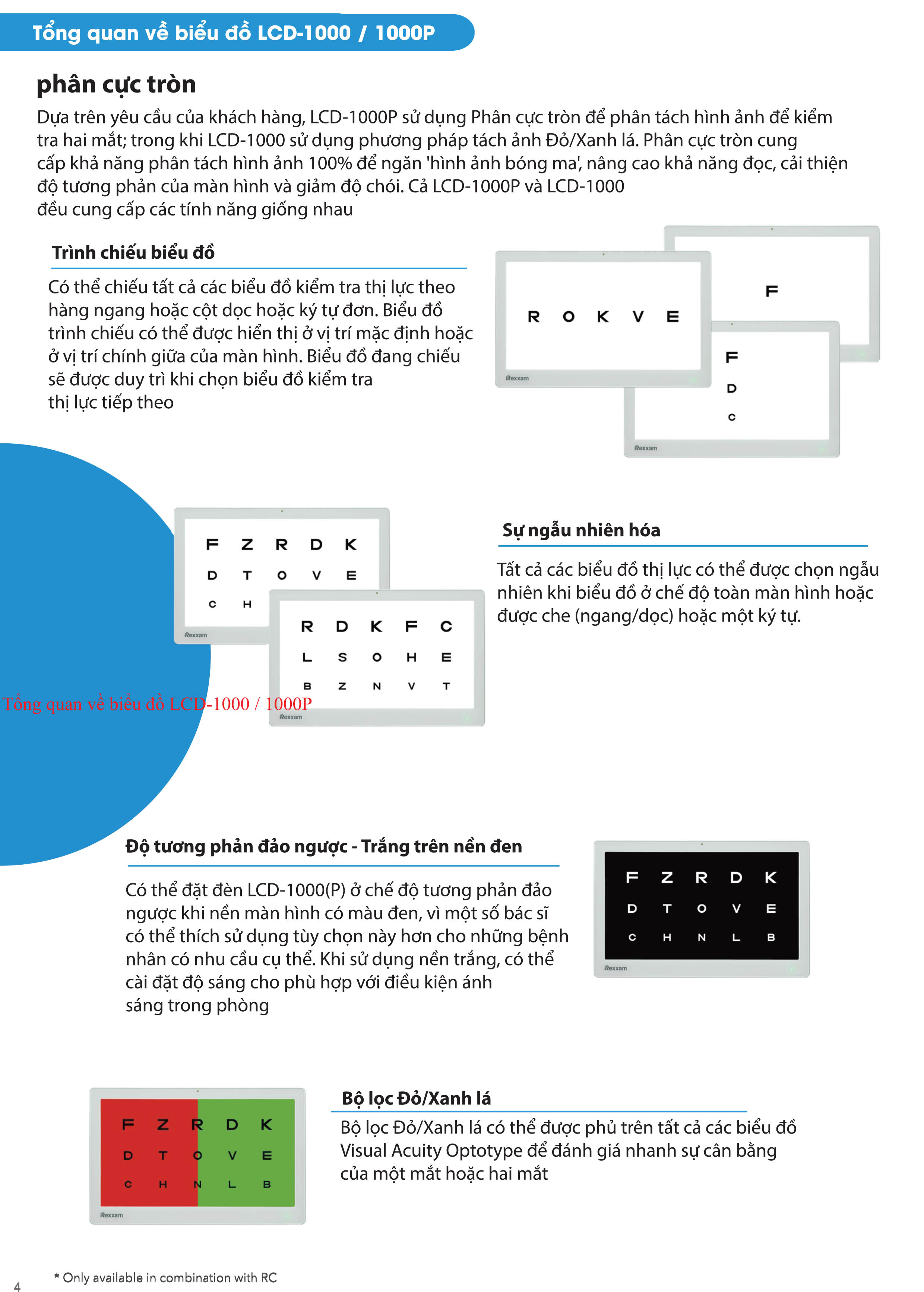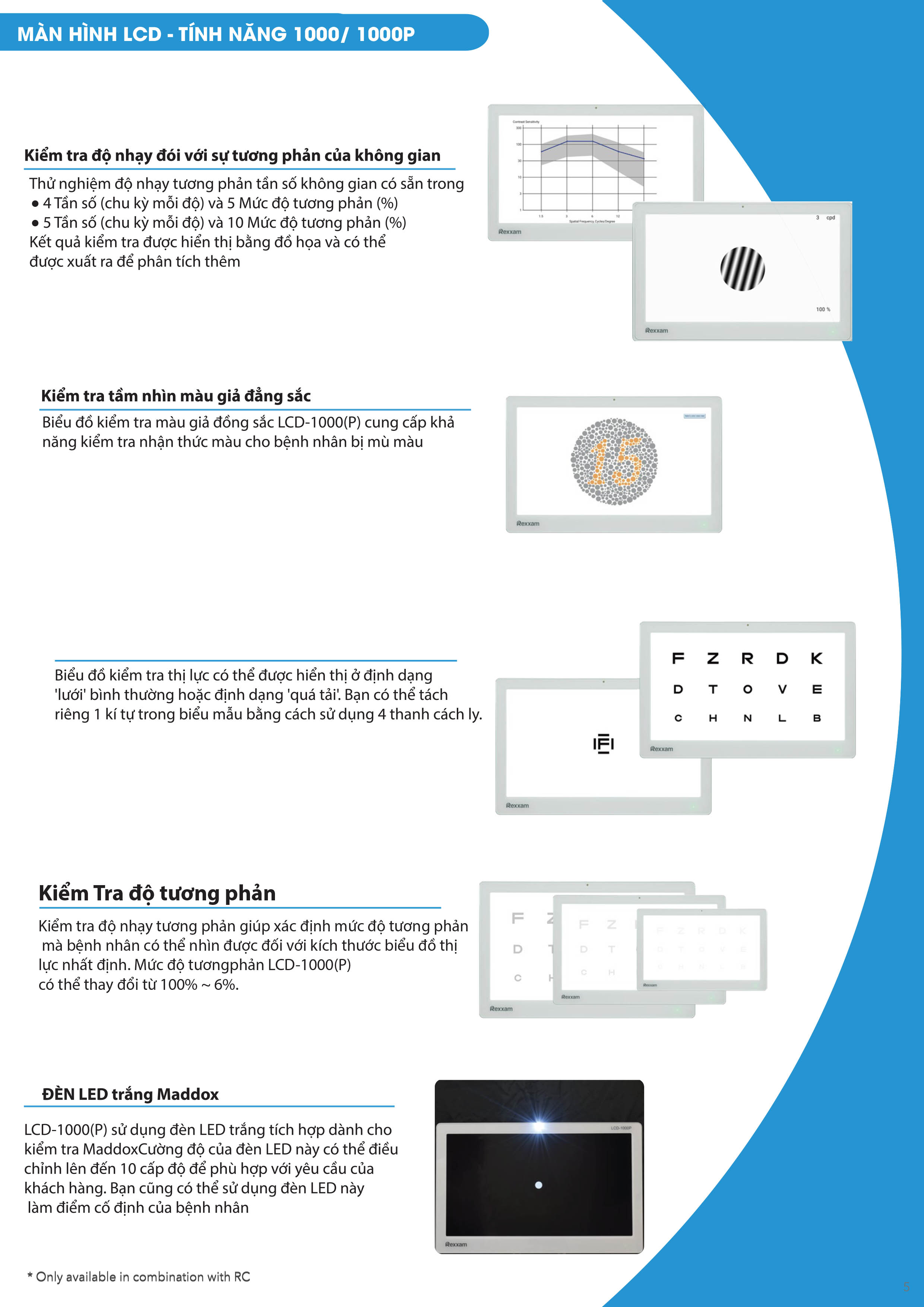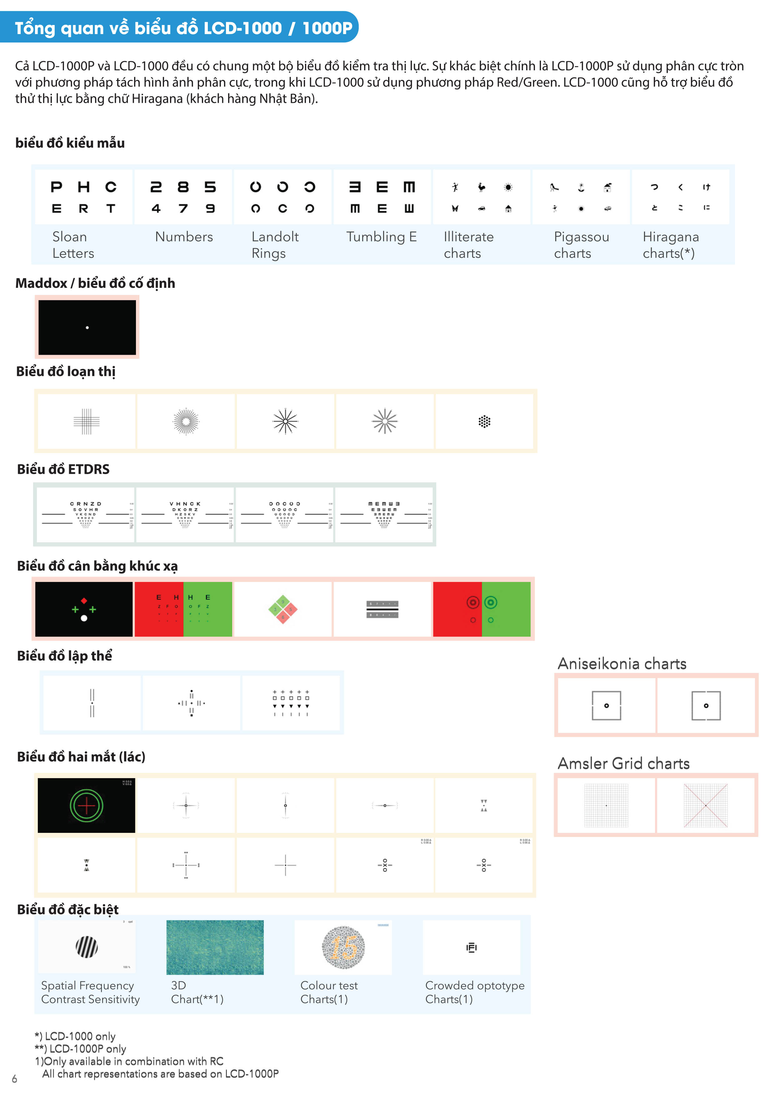 Nhiều biểu đồ Optotype, biểu đồ ETDRS, biểu đồ hai mắt, biểu đồ lập thể, kiểm tra độ tương phản.