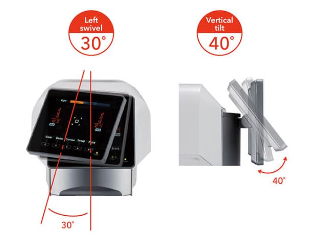 Màn hình xoay trái 30° cho phép người dùng hỗ trợ vị trí của bệnh nhân trong khi vận hành cần điều khiển. Độ nghiêng dọc 40° giúp vận hành thuận tiện ở tư thế đứng hoặc ngồi.