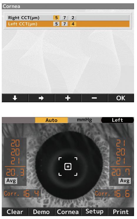 Giá trị IOP được tự động hiệu chỉnh (Corr.) bằng đầu vào của phép đo độ dày giác mạc trung tâm. Việc hiệu chỉnh có thể được thực hiện trước hoặc sau khi đo.